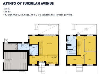 Townhouse-talo A on 134 m² kokoinen päätyasunto, joka yhdistää avaruuden, toimivuuden ja yksityisyyden. Kodin sydämen muodostavat avokeittiö, ruokailutila ja olohuone, joiden suuret ikkunat ja päätyaseman lisäikkunat tuovat upeasti luonnonvaloa sisään. Tilavalle, katetulle terassille avautuvat näkymät tekevät arjesta nautinnon – paikka aamukahville, grilli-illoille tai vain rentoutumiselle.