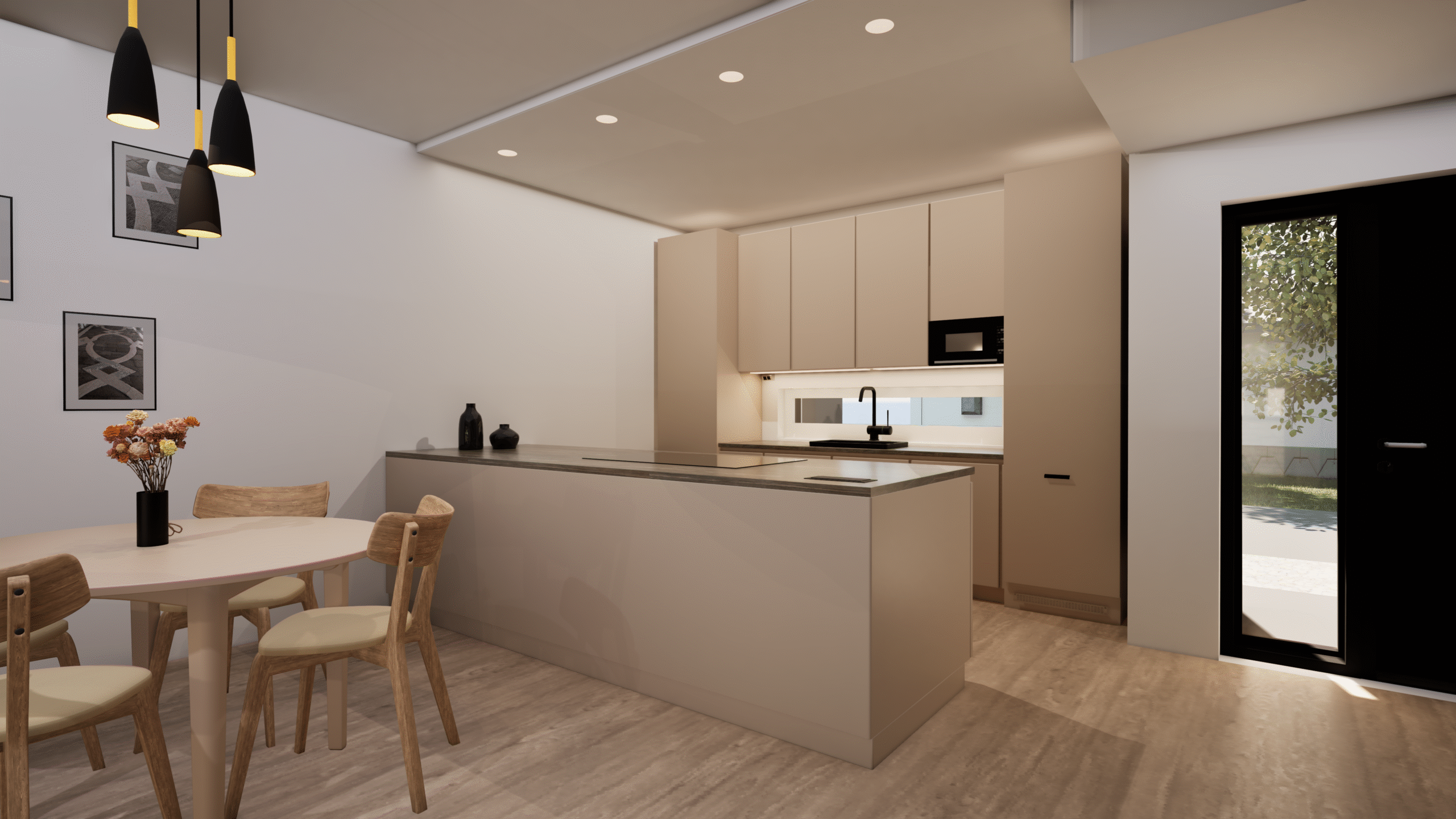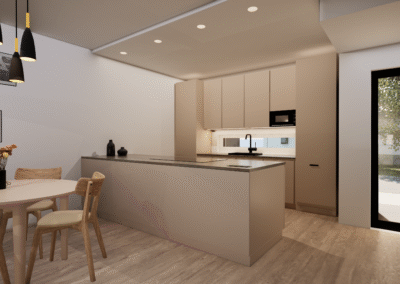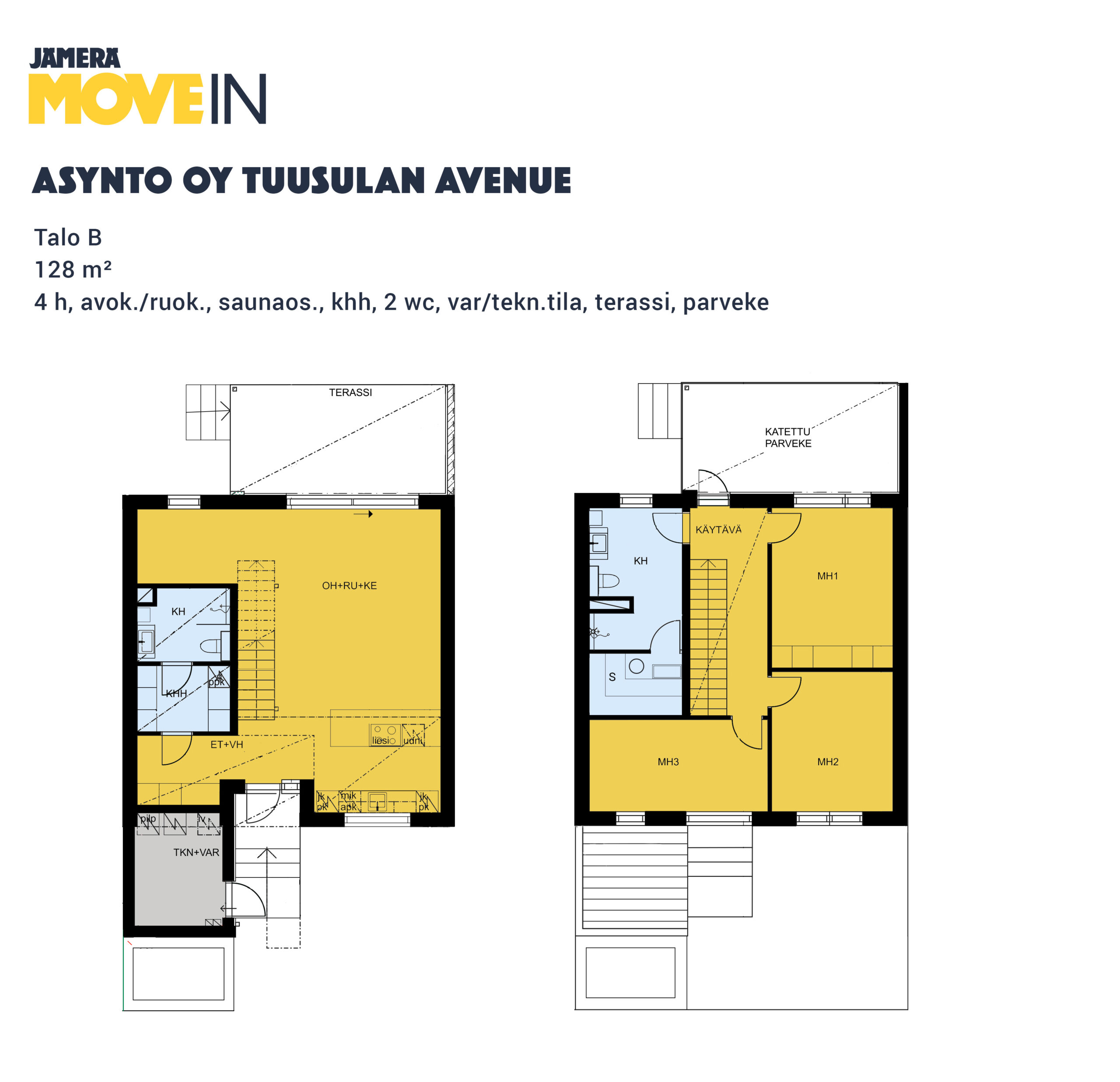 Townhouse-talo B tarjoaa 128 m² harkittua tilaa kahdessa kerroksessa, yhdistäen modernin asumisen toimivuuteen ja viihtyvyyteen. Avaran olohuoneen, ruokailutilan ja avokeittiön kokonaisuus täyttää arjen tarpeet tyylillä, ja suuret ikkunat tuovat runsaasti luonnonvaloa sisään. Terassin yhteydessä oleva pieni nurmialue tarjoaa viihtyisän tilan oleskeluun.