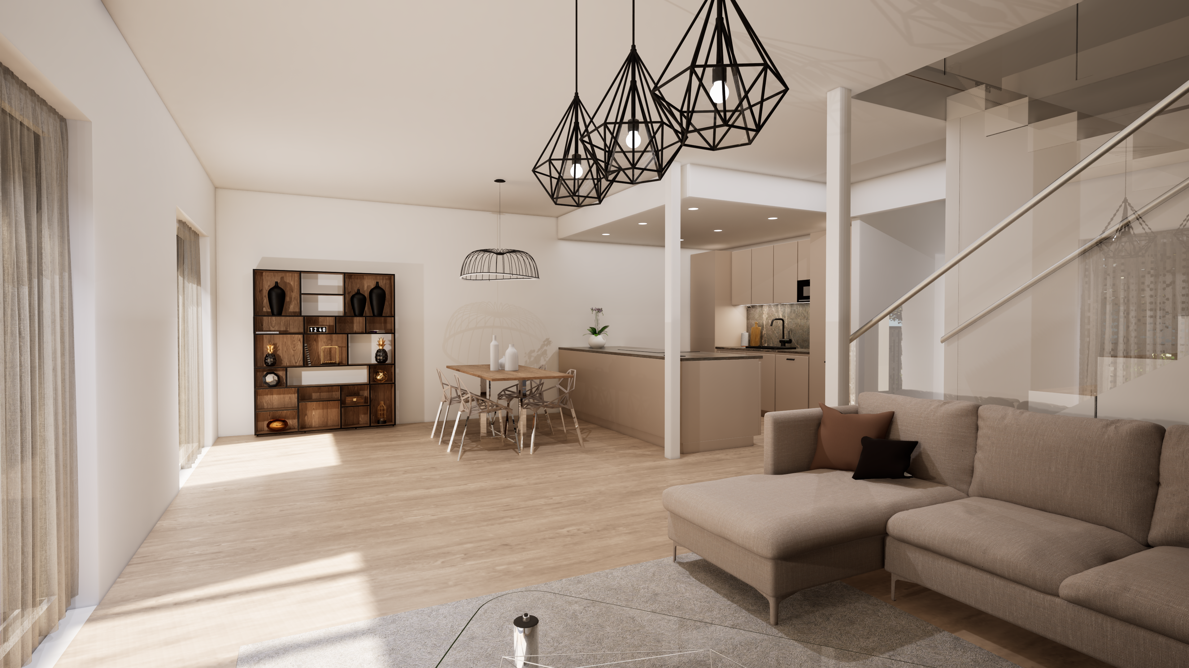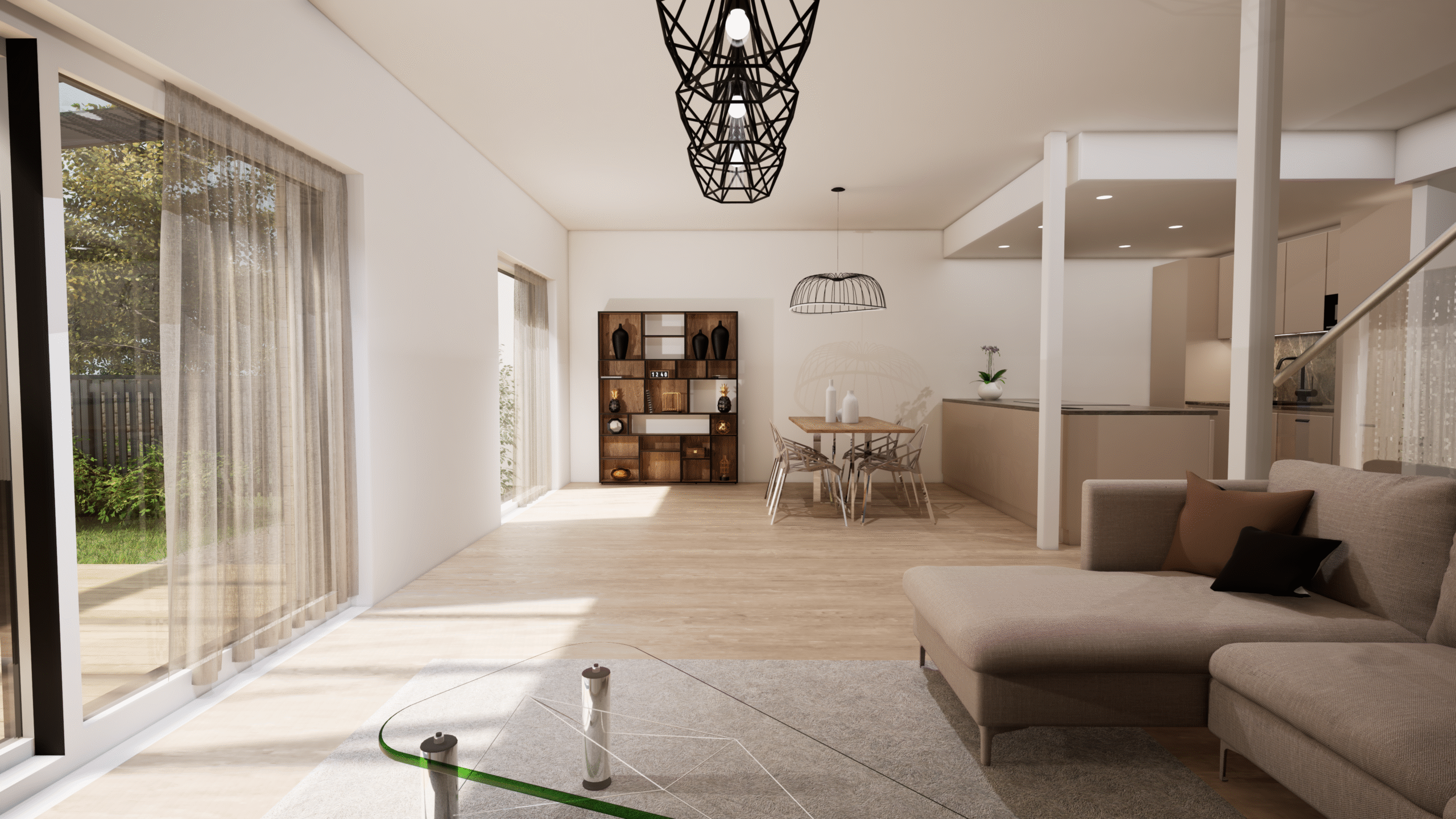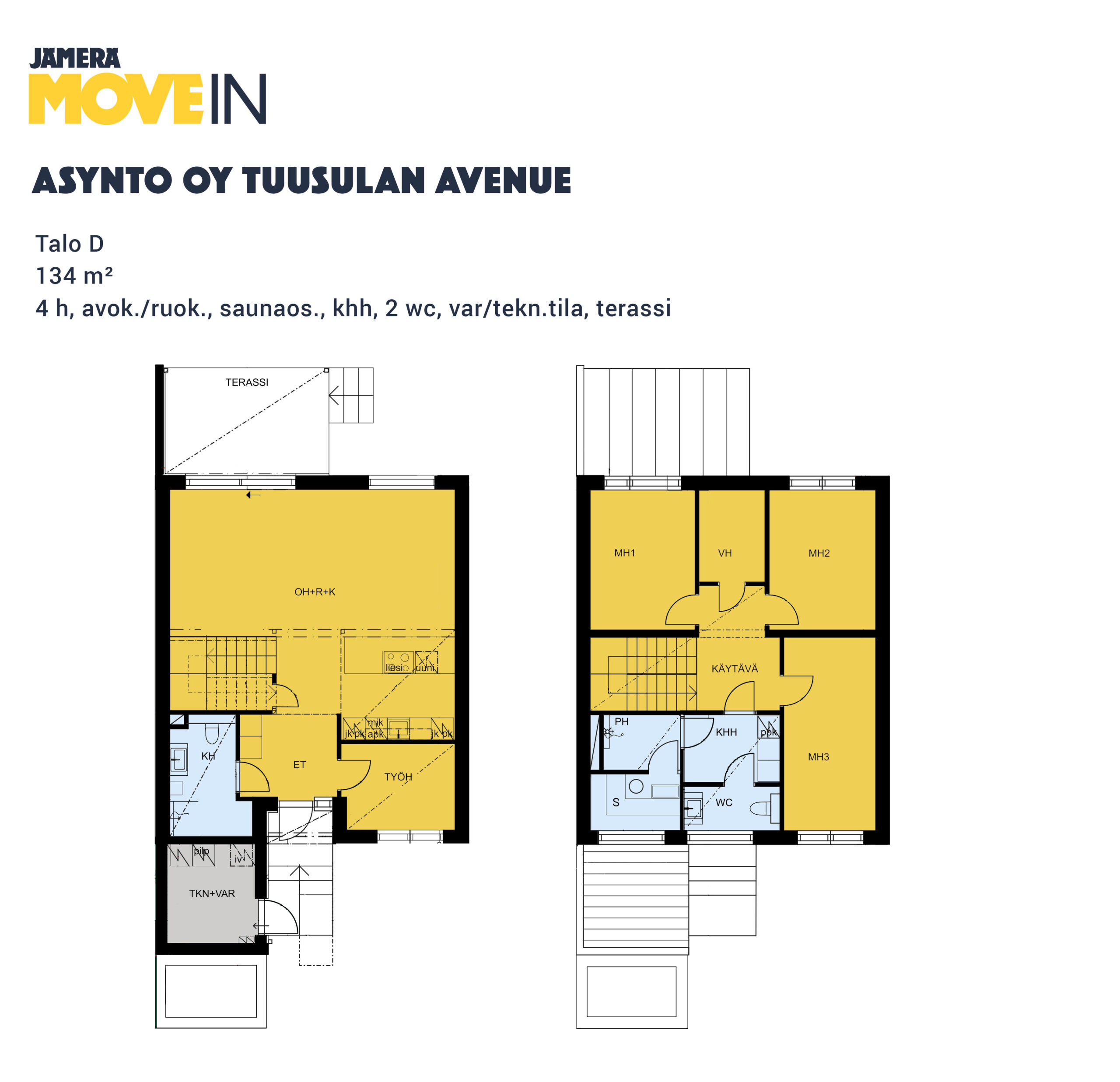 Townhouse-talo D tarjoaa 134 m² modernia ja harkittua asumista kahteen kerrokseen jaettuna. Kodin sydämen muodostaa ensimmäisen kerroksen valoisa olohuone, ruokailutila ja avokeittiö, joista on suora yhteys katetulle terassille. Suuret ikkunat tuovat sisään luonnonvaloa ja tekevät arjesta avaraa ja viihtyisää.