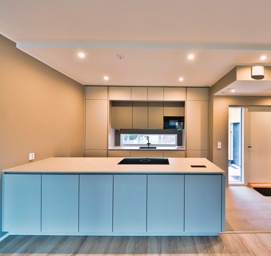 Townhouse-talo I tarjoaa 136 m² tilaa ja tyyliä kahdessa kerroksessa, ja sen sijainti päädyssä tuo lisää yksityisyyttä ja luonnonvaloa. Ensimmäisen kerroksen avara olohuone, ruokailutila ja avokeittiö muodostavat kodin keskipisteen, jossa isot ikkunat ja lasiliukuovet avaavat näkymän katetulle terassille – täydellinen paikka ulkona viihtymiseen. Käytännöllisyyttä tuovat erillinen kodinhoitohuone, työtila ja vaatehuone.